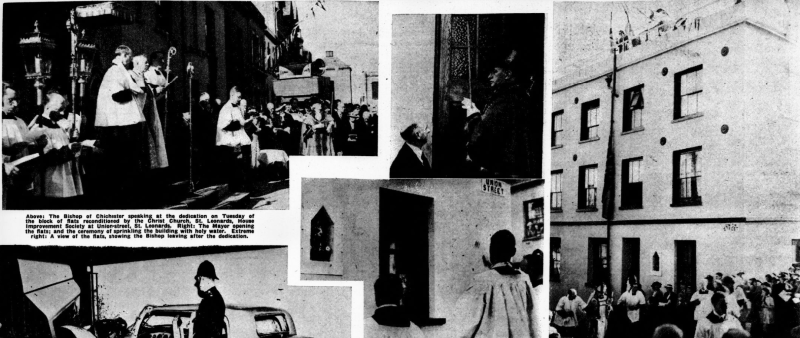 The Hastings Observer, 23 May 1936, reported on the opening of the (five) flats by the Mayor, the Bishop of Chichester (Dr Bell), and other dignitaries. Many people watched the ceremony from nearby rooftops. Afterwards there was a return to Christ Church where the Te Deum was sung. Below is a montage of photos, in the same issue, which were taken on the occasion. They show the niche which is still there at 5 Union Street.